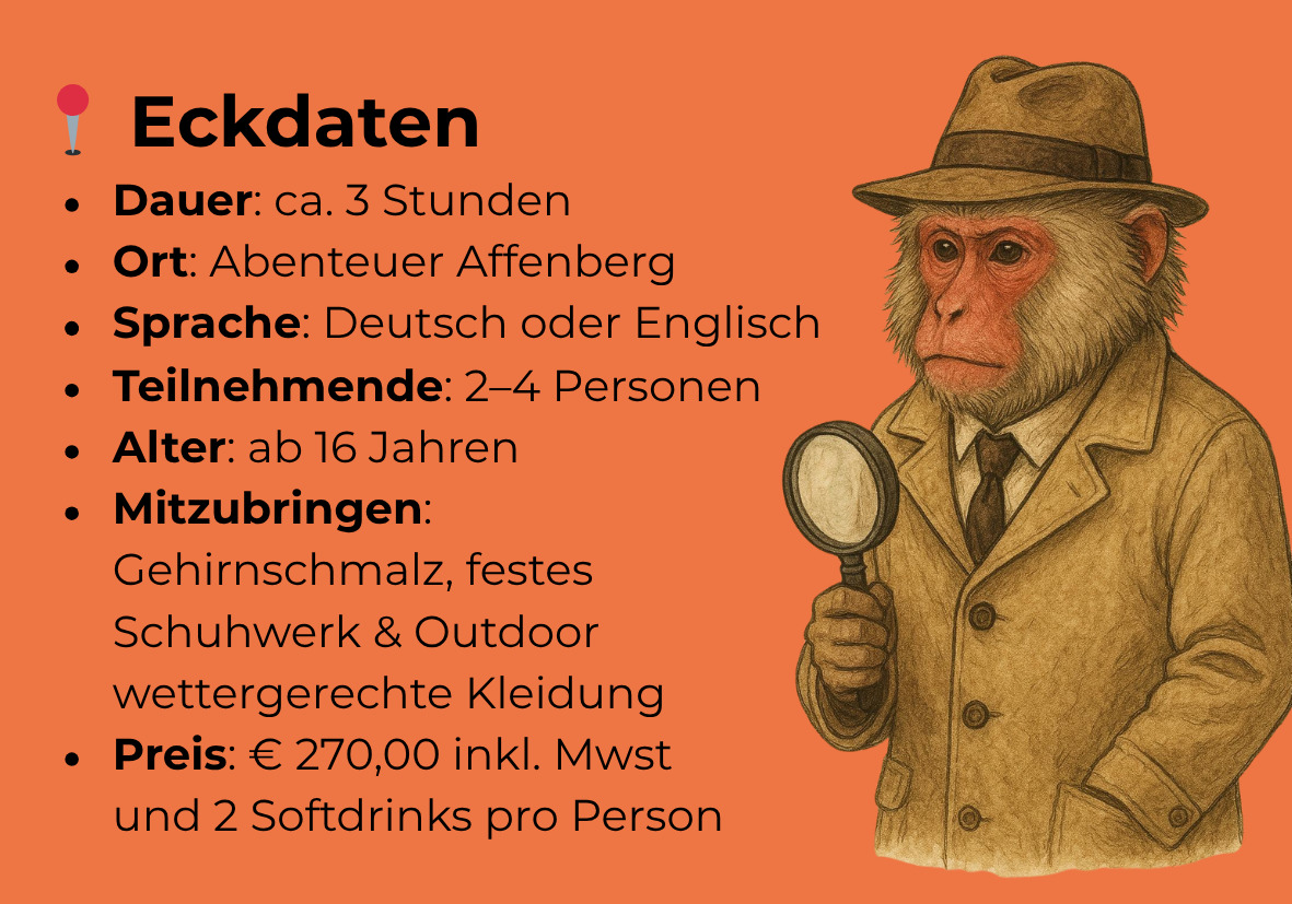 Dieses Event verbindet Natur, Wissenschaft und Spannung zu einem einzigartigen Abenteuer. Während ihr von neugierigen Japanmakaken umgeben seid, taucht ihr in eine packende Geschichte ein und werdet selbst zu Forschenden. Das Monkey Mystery vereint was wir am Affenberg gut können: Affen & Wissenschaft. Es wurde im Zuge des FFG Kooperationsprojekt „Smart Monkey Lab“, welches wir gemeinsam mit der Universität Wien und der FH Kärnten/Villach führen, von Lena Pflüger und Roy Hammer entwickelt. 👉 von schlauen Köpfen für schlaue Köpfe 🧠